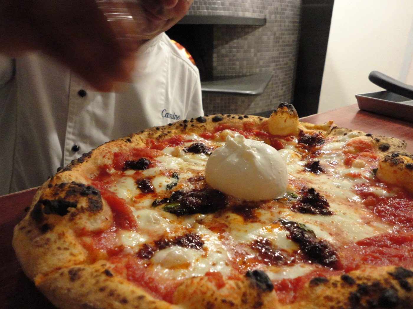 I adore the Maradona Pizza, named after the famous bad-boy soccer player born in Argentina who brought team Napoli to victory in the 80’s. It starts as many others do with the best tomatoes grown in the rich volcanic soil of Mt. Vesuvius and topped with just enough mozzarella. Before it heads into the 900-plus degree wood-burning oven, dabs of Nduja, a creamy spreadable salami from Calabria is dropped on the surface. After just 90 seconds a sizzling-hot pie emerges, and is quickly christened with an entire ball of burrata. The cool, milky cheese plays against the somewhat spicy sausage for a perfect bite.
