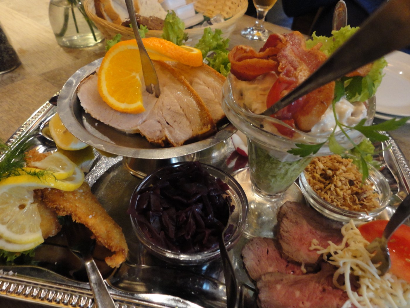 Dark and dense, smeared with the pale, slightly aromatic butter, the bread makes a study base for the flavorful toppings. Custom dictates a three-course lunch include a fish selection, followed by a meat, and finally a cheese eaten with fruit. Popular seafood choices are pickled herring with onions, capers, and dill or a crispy breaded filet of pliace – European flounder served with a mustardy tartar sauce locals refer to as remoulade. Meats can include buttery, tender roast beef with crispy onions and snowy horseradish, creamy chicken salad topped with salty bacon, or warm roasted pork, cracklings attached foiled by tart red cabbage.